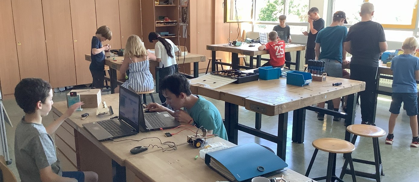 Die micro:bit-AG ist mittlerweile fester Bestandteil des Mittagsprogramms am Bildungszentrum Bonndorf geworden. So bunt wie dieses Jahr waren wir jedoch noch nie! 12 Schülerinnen und Schüler aus der Grundschule, der Realschule und vom Förderzentrum SBBZ von Klassenstufe 4 bis 9 arbeiteten gemeinsam, lernten voneinander und miteinander. Sie lernten grafisch zu programmieren, löten, leimen, kleben, verbinden und konstruieren… Und so entstanden Schritt für Schritt kleine individuelle Roboter mit Herz.